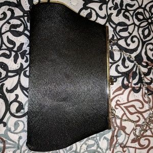 Elegant black satin evening bag with sequins, beads and a few rhinestones make this a must-have for those special occasions. Silver clasp and removable chain with approximately 23" drop. Back of clutch is black satin with no embellishments.