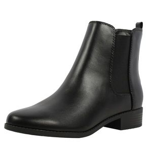 Always trendy Chelsea short boot featuring round toe, faux leather, pull on style, and heel 1 1/4". Model is a size 7 and a size 7 fits her perfectly.