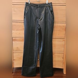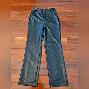 Black faux leather wide leg pant. Like new - worn only once. Measures approx 13" waist (flat), 31" inseam, 12" rise. Zipper, button, and hook closure at waist. Front pockets and faux back pockets. Great with heels or boots!