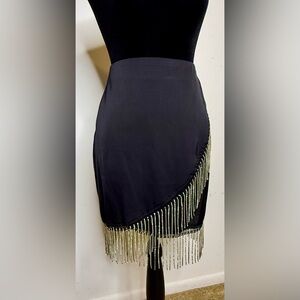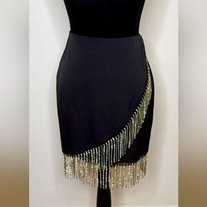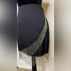 Black faux wrap skirt with sparkling rhinestone fringe side zipper medium EUC