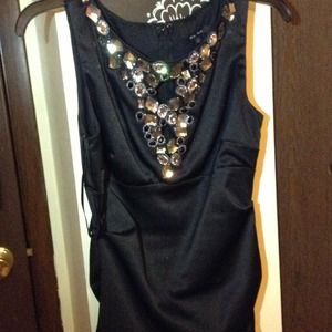 Very Sexy fit, neckline has gorgeous jewels. Hem comes right below knees. Back zipper