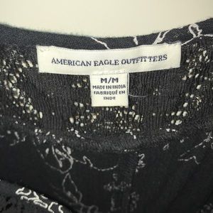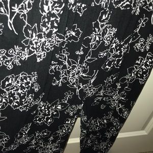 Black in color, white floral print, has pockets! jumpsuit, scrunched at the waistline and ankle, lacy around the neckline and along the top of the back, spaghetti straps. Very light and airy!