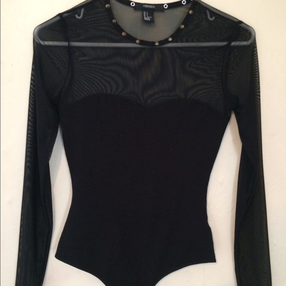 Stretchy ,sheer in the breast and arm area gold studs around the neck only been worn twice
