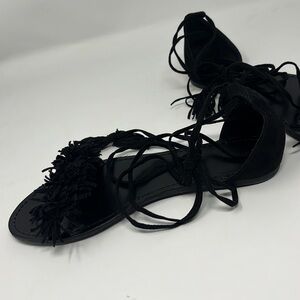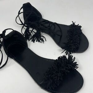 Black fringe ankle wrap sandals