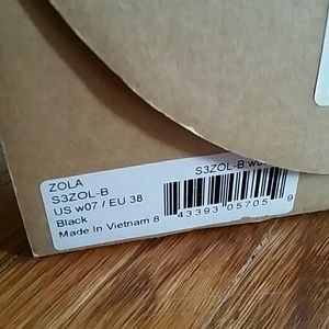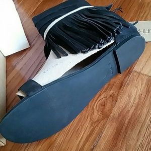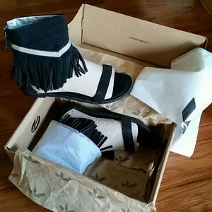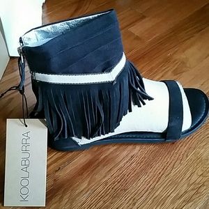 NEW in box! Includes ALL original packaging, duster bag, and warrantee form. Black Zola sandals, by Koolaburra have a black + silver canvas ankle zip and leather fringe, with no heel /flats. Never worn and perfect for end of summer, vacation, and/or a costume /Halloween.