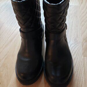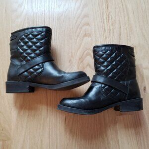 Matisse genuine leather black boots. Moto engineer style. Size 8 M. Very nice quilted-looking leather on part of the upper. Decorative adjustable buckles on side and upper back. Heel approximately 1 3/8" high. Boot height 7.5 inches in back. Made in Brazil. Very good pre-owned condition. Very slight wear on heel. Please see all pictures provided.