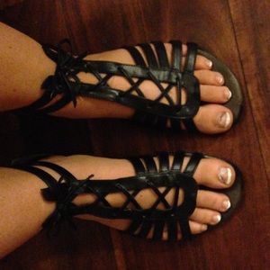 Black strappy gladiator sandals with lace up ties in the front and zipper in the back