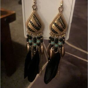 Beautiful Black gold and teal bohemian feather drop earrings w dangle rope fringe tassel