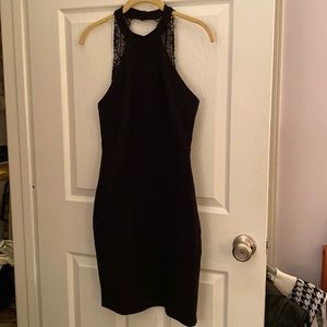 Black halter top mini dress with lace back