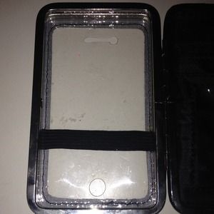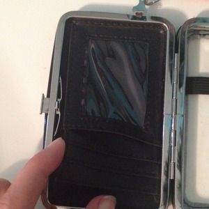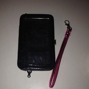 Black hearted designed phone/wallet wristlet. Been used a couple times. Screen is not dirty that was just the back-round.😄 (sorry) preferably for iPhone 4/4s maybe could fit iPhone 5
