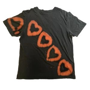Originally a plain black v-neck was upcycled using our heart bleach stencil treatment.