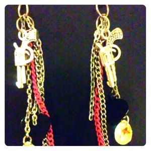 Chains,black hearts,crystals and lil guns on hook earrings. Hot pink,silver and black!