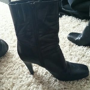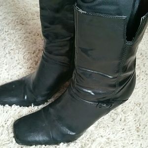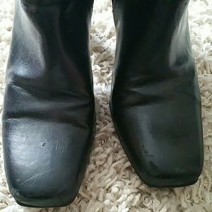 Black heeled boots with tiny belt and zipper on side, with normal wear