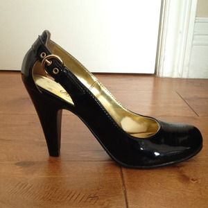These are the perfect black heel for any occasion. (These were my favorite shoes, but don't fit anymore). Very comfortable and cute! Pretty good condition. The insides are losing color (pic 3). Back heels have small marks on them.