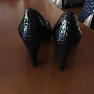 Black, patent leather look heels. Very comfortable. Slightly worn.