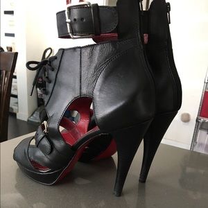 Ankle strap with buckle. Lace up with buckle across the front. 5" heel