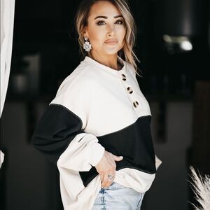 Our Wyoming Sweatshirt is a soft blend of french terry. I features a color block of black and ivory with a button front. We love the chic, classic, easy to wear style. Style this with denim shorts or jeans all year round. It's a piece you'll keep in your wardrobe for years to come.