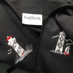 Excellent condition jacket. Zipper front. Collar. Elastic cuffs. Drawstring bottom. Side pockets. Lighthouses appliqué all over front. Lighthouses are red white and grey. Bon Worth tag. Fabric and size tag is cut. Approximately size Large please check measurements.