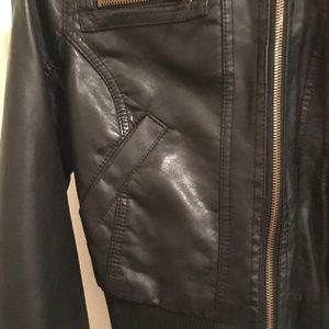 Black leather jacket (not real leather). With hoodie and pockets. Leopard inside. Runs small.