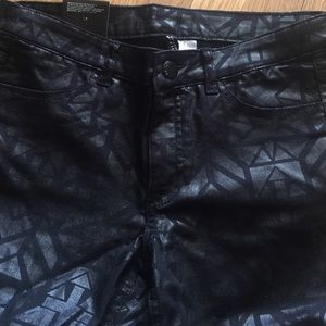 Black super slim leg jeggings with zipper and button. Two front and two back pockets. Star design