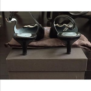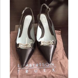 Lambertson Truex Black kitten heel with chain detail and white top stitch Sz 36-1/2. Comes in original box with dust bag.