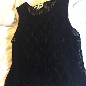 Worn but in great shape. Black, all see through lace, looks great over a camisole, or silk blouse as pictured.