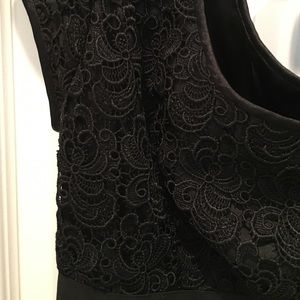 Black lace dress. Wide waist band for flattering shape. Full length open back zipper.
