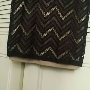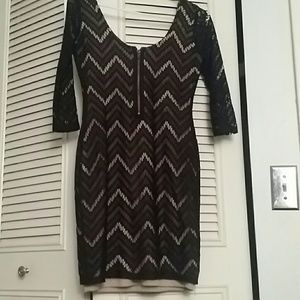Black lace/crochet over nude. Knee length. 3/4 sleeve. Exposed zipper. Wore once. Gorgeous!