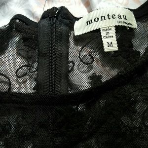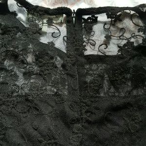 A lacey black dress with zipper on back. The dress is knee length. Size medium but fits like a small.