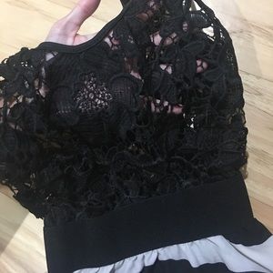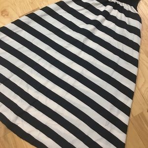 Black and white stripes on bottom, sheer black Lace-y design on top. Right waist band. Would be great with a bandeau bra underneath. I'm 5'9" and it's about 3 inches away from touching the floor for me. NO TAG inside it was ripped out. Fits appx a size 2-4