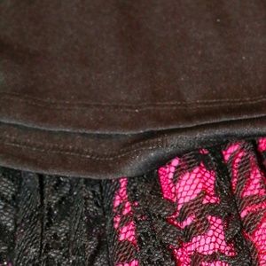 Short black lace skirt with tags. Skirt has an inner liner 22" with lace overlay 24" and a thick elastic waist line.