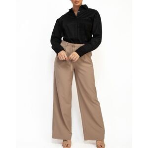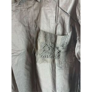 A smart casual shirt top in solid color featuring long cuffed sleeves, collar, button-down, big chest pocket with lace detail, and a waist length curved hem.