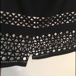 Black knee-length pencil skirt with laser geometric cut outs. Cream liner peeks out. Side zip, slit in back.
