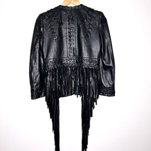 Incredibly flattering black leather cropped fit with super fun fringe. Excellent condition, some of the cross-stitching details have come loose on the front and back, see close-up pics, but barely noticeable.