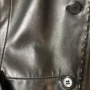 Black leather coat with white piping. Very soft, quality leather. Very stylish and in great condition. One loose button and one missing button.