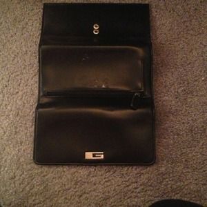 Black leather guess wallet. Has some wear on the back. Opens three fold with check book holder and plenty of room for credit cards!