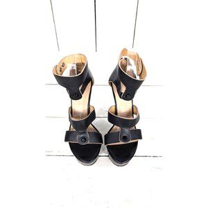 Black leather high heel platform open toe ankle strap heels
