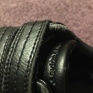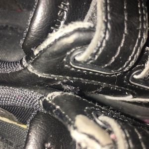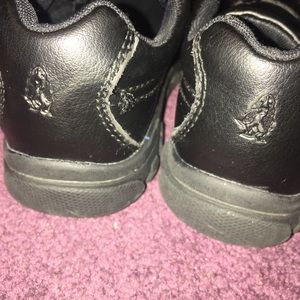 Black leather shoes. Perfect for school. A few flaws but lots of life left in them. The peeling around the edges near the straps is easily covered by the pants leg. Real leather hush puppies.