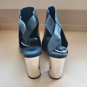 Black leather open toe booties with silver metallic heel, size 7, buckle closure at ankle, by Banana Republic. Very good condition.