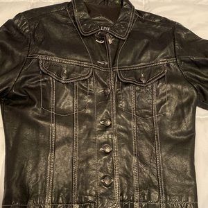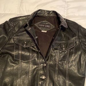 Black leather jacket by clean lines, size medium 100 % leather, white stitching details throughout the entire jacket, two pockets with bottom closure. Purchased in Italy over 10 years ago and still in perfect condition.