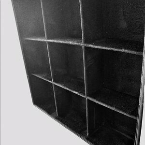 Vintage 1990’s leatherette suede lined watch or jewelry case. Made for Red Envelope , probably for watches, it has 9 compartments each measuring 3.5” x 4”. Perfect for watches, bracelets, pins, or necklaces. Sturdy weight, has suede on all inside surfaces, as well as the bottom. Good vintage condition, it does have some small dents and marks on the top, one scratch 1” long, and one inside corner has a slight bend. Because this is black the imperfections are not that visible. Quality item.