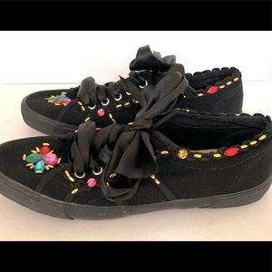 Black linen sneakers nicely embelished with red blue pink and green acrylic stones beadings. Very comfortable walking shoes with black rubber outsole and lace-up closure with black satin laces. Eur size 40 and they fit US size 9.5-10. Used gently few times and are just like new.