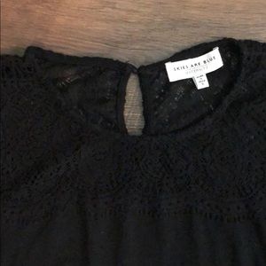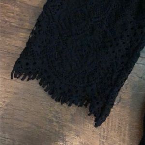 Black, form fitting maternity dress with 3/4 length lace sleeves. Lace detail on front and back at neckline. Keyhole opening on back of neck with button detail. Side ruching. Worn once. Great condition!