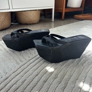 Infrequently worn flip flop style black & glittery strappy platform sandals by Jeffrey Campbell. Wear and measurements are shown in the pictures.