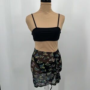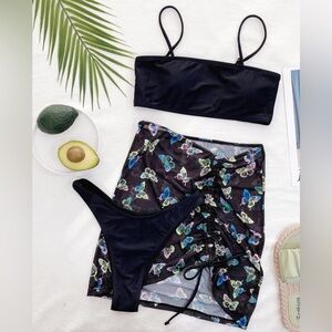 SHEIN black 3 piece swimsuit set. The top is a square neck bandeau style with adjustable spaghetti straps. Has removable padding inserts. Bottoms are a solid black cheeky style. Skirt is a mesh style with a colorful vibrant butterfly print. Has a drawstring on leg to wear cinched. Super cute & flirty. Perfect for the pool or your next beach vacation. Good used condition, no major signs of wear.
