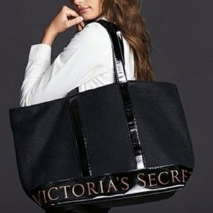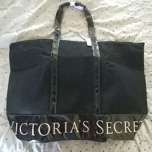 Great bag for the beach or anywhere. Double layered mesh sides. Two straps. Zips across top. Reinforced patent leather base with Victoria's Secret in pink
