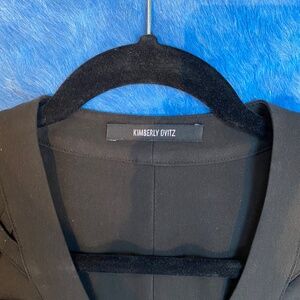 Black minidress with intricate bands of fabric on the front of the dress.