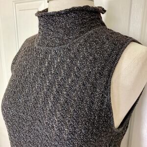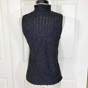 Black & white marled mock neck sleeveless sweater. Women's size medium. This sweater features wool & rayon open textured fine stretch knit. Pullover style. Wonderful layering piece for a capsule wardrobe. Excellent pre owned condition. No notable flaws or signs of wear.