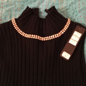 Black ribbed mock turtleneck with rhinestones at neckline. Partial zip in back. 20" from shoulder to hem. NWT