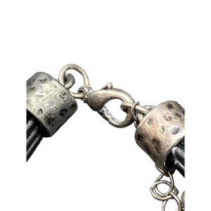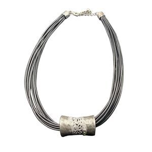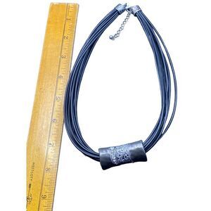 Black multi strand necklace with treated cord silver tone filigree rhinestone pe